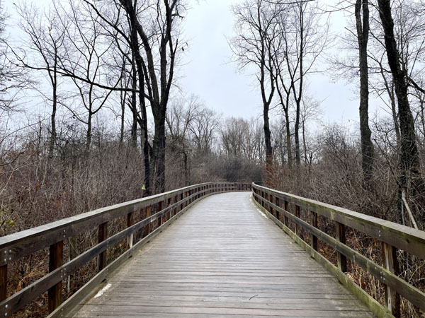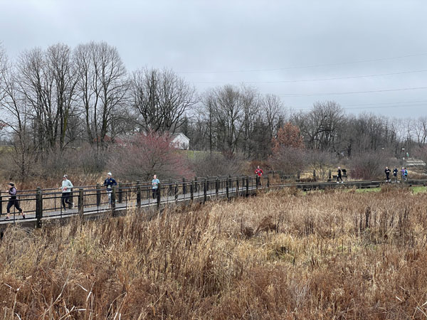 Because I got there so early, I had plenty of time to run a couple of miles to warm up. I ran through part of downtown Dexter to the path along the Huron River that would be a part of our race route. I came across some boardwalks that concerned me a little bit. It wasn’t raining anymore, but it had rained earlier and the boardwalks were a little wet. I’m thankful that temperature was in the high 30s. Had it been any colder those surfaces could have been dicey! I found that I was able to run on the boardwalks without slipping so it reassured me that I would be okay during the race.