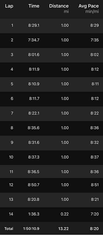 My pace was in the 8:30s for miles 8-11 but jumped to 8:51 for the twelfth mile. By that point my stomach didn’t just hurt, it was also sloshing around and I wondered if I’d have to make a stop. Slowing down was my best bet to get through it.