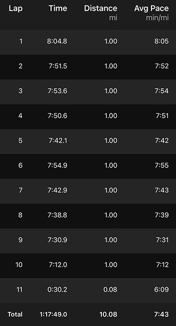 Once again, the momentum of the crowd probably helped pull me along because somehow I got rolling. I sure wasn’t going to run anything close to a PR but I managed to consistently stay in the 7:30s which is much faster than I would have guessed based on my warm up jog.