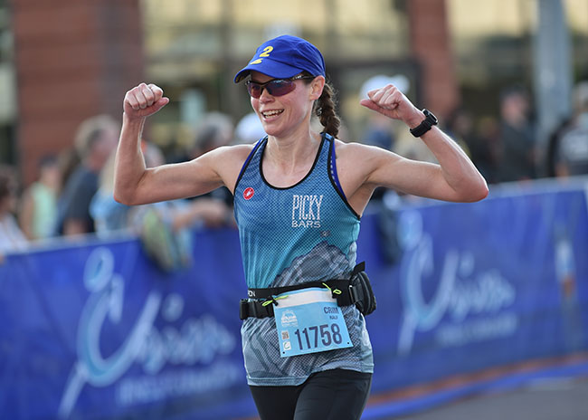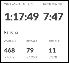 Within the last half mile I heard “Runnin’ Down a Dream” by Tom Petty blaring along the course. I love Tom Petty and I love that song, and it was at the part near the end of the song where Mike Campbell is on fire with the guitar. As many times as I’ve heard that song and as warm as I was, it still gave me chills. That was just before the long straightaway on the course that heads to the finish. I love that stretch and gave it my all, finishing in 1:17:49.