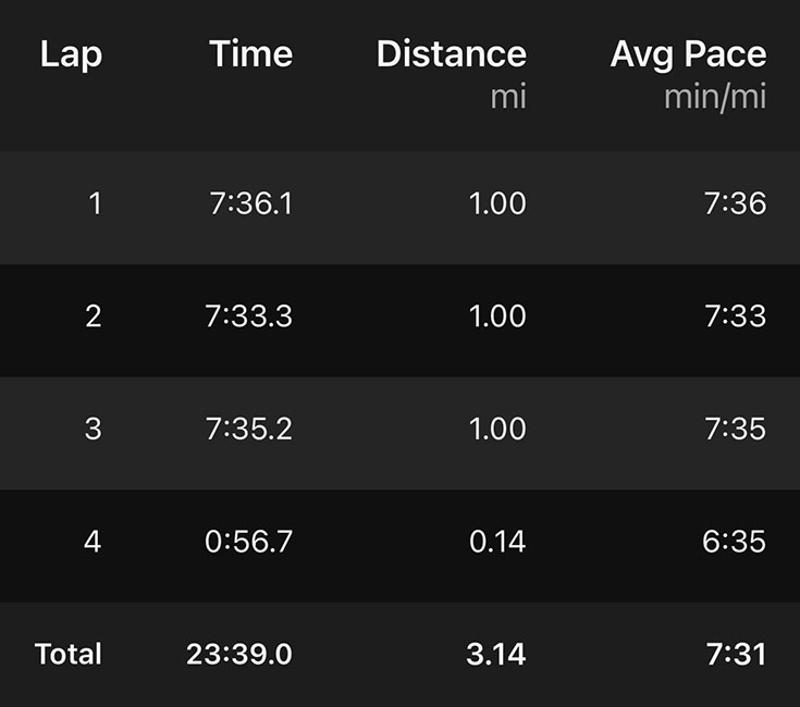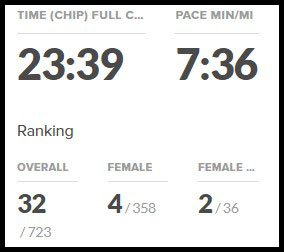 I had a little extra kick at the very end and finished in 23:39. I was plenty happy to average 7:36 per mile and shocked again that I even had that in me.