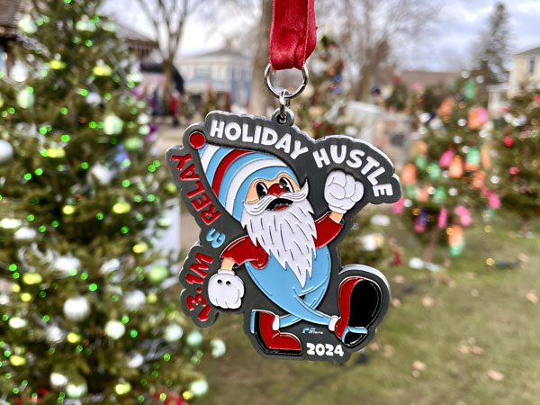 My Holiday Hustle medal with the trees in Monument Park as a backdrop