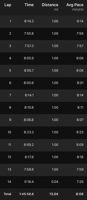 It was the third time I had run this route and I knew there were some rolling hills but I didn’t really think about how challenging it was. There aren’t any major climbs so it’s kind of deceiving. Last year I thought I had started the race too fast and suffered for it in the second half. This year I realized maybe that wasn’t the case and it was just because the course is frickin’ hard! I slowed down during the second half this time around as well. When I slowed down by 15-20 seconds for a mile here and there, some people I had passed earlier caught back up. I had to remind myself that I was lucky I was even healthy enough to pull this off. I shouldn’t be “racing” anyway or it might mess up the long run I needed to do the next day. I tried to keep things in perspective and just do what felt manageable enough. I didn’t push to my max but it felt like a comfortably hard enough effort. I worried about coughing my way through the race and I did at moments but it was fairly minimal. It was only during the last mile when I tried to pick up the pace that I thought I might need to back off a little. Breathing harder didn’t work so well with my pre-existing issues! Still, I finished strong which pulled me in just under 1:46 with a time of 1:45:55.