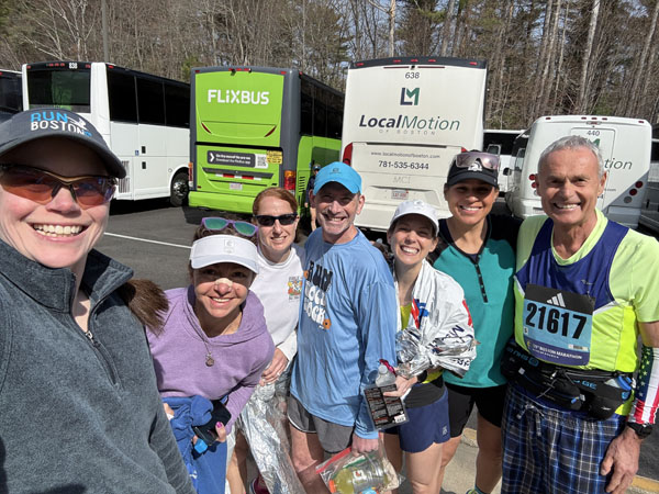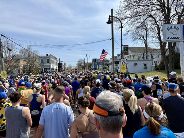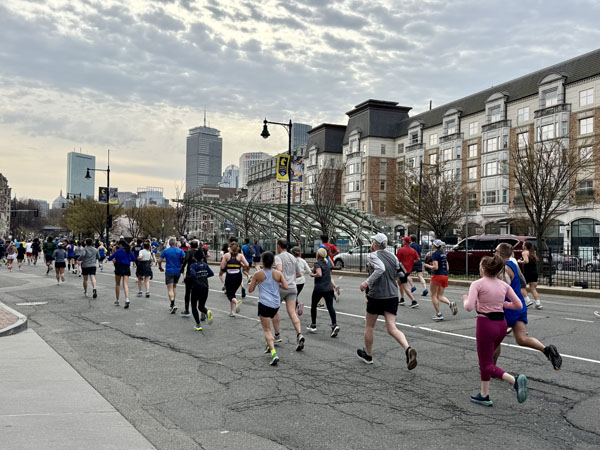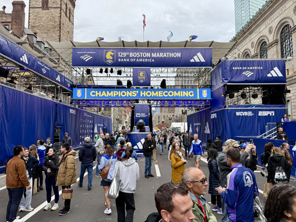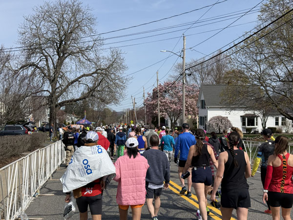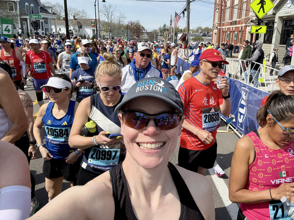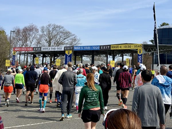 We arrived by 8:00 but I had a couple hours before I could exit Athletes’ Village. That time always tends to drag. I’ve found that sometimes I get a bit too warm on the bus so I try to juggle resting my legs with going out to get fresh air during the long wait. That’s why it’s always nice when I befriend people on the bus, and that happened once again this year. I overheard my seat mate talking about a guy named Bruce and was pretty sure it had to be the same Bruce who I know. Eventually I spoke up and asked if he was her coach which confirmed it. That started my chat with Tamara, who determined that we must be running twins because we’re both 45 years old, both running Boston for our fifth time, and likely to finish with similar times. It was fun to make a new running friend and help pass some of the time.