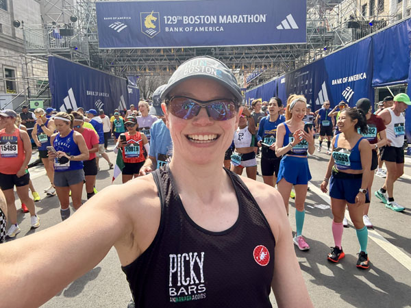 Marathon Monday finally rolled around and I was a little anxious but ready to go. Although street noise around my hotel had been a major problem for sleep on Friday and Saturday nights, luckily things were quiet on Sunday night and I may have gotten around seven hours of sleep. I was up by 5:15 and left an hour later after eating one of my protein Picky Bars, the first of several stages of eating throughout the long morning before I got to race at 10:50. It usually works for me to eat another Picky Bar at 8:00 and another around 9:20, plus I try to stop drinking by then aside from a few sips of water. Then I eat one Clif Blok before starting. When I find something that works I try to stick with it!