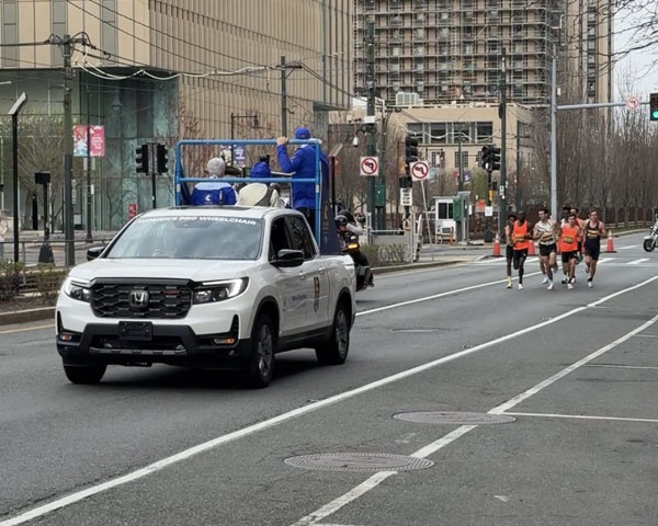 I found a spot almost two miles into the 5K course with very few people around that made a great place to spectate. It was fun to see the various waves of leaders come through – the wheelers, elite men, elite women, then everyone else.