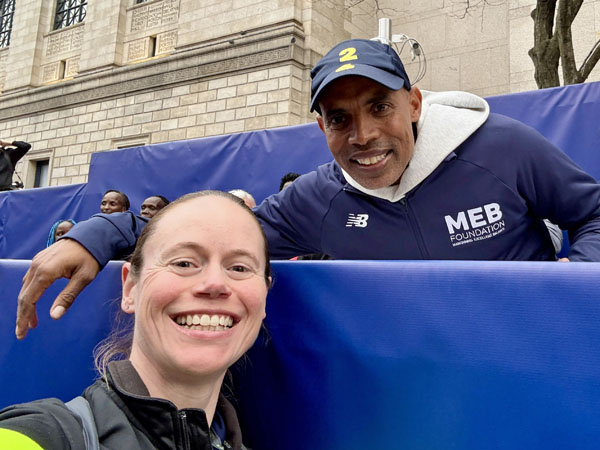 I had also hoped that I might see Meb Keflezighi near the finish line area for a “champions’ homecoming” event right after Deena’s panel. I made it outside just in time, and sure enough, Meb was there. Like Deena, Meb is all about the positive mindset and he’s one of my running heroes. I have seen him each time I’ve been to Boston and wanted to keep that streak going! I guess chatting with him at the finish line last year was memorable enough that he recognized me and gave me a warm greeting. I had to get another selfie with him!