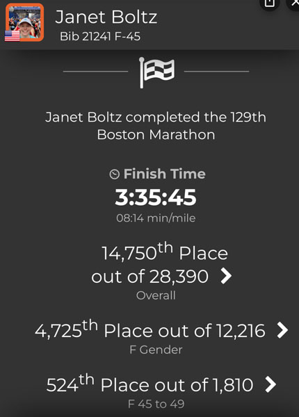 My fastest race in Boston was in 2022 when I ran 3:35:35. I had hoped to beat that but came in just 10 seconds slower with 3:35:45. I had no hang-ups over not beating that time at all. I was close enough and feeling so strong at the end had me thrilled. It FELT like one of my best races and that’s what mattered.