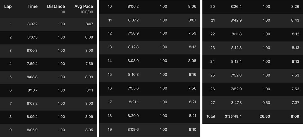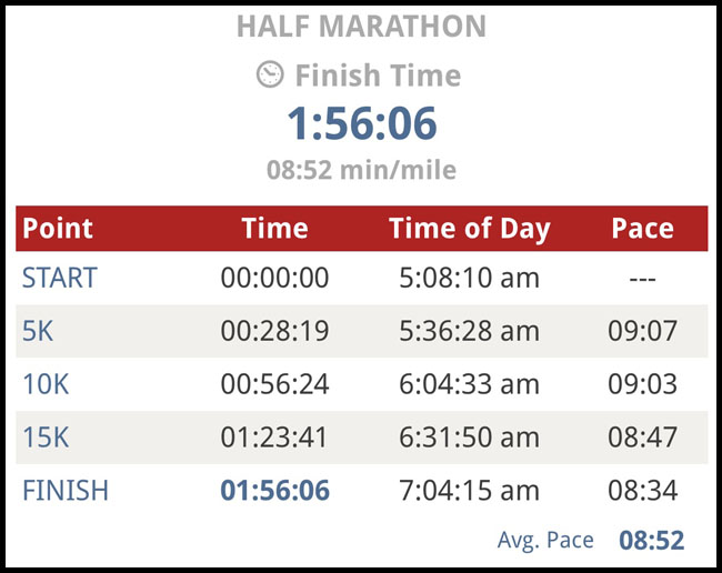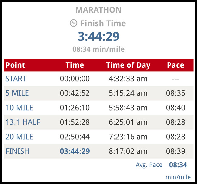 I made sure to grab water at every hydration station and also sipped some of my own electrolyte drink now and then. I ate a Clif Blok every other mile starting with the sixth mile. I ate caffeine Bloks to start, then switched to some with extra sodium later in the race. This was the second marathon where I also sucked on salt tablets every other mile starting with the seventh mile. I tend to be a salty sweater so I’ve been trying them to see if it helps. It seems to be working so I keep doing it. By the time I got to miles 21 and 23, the salt got to be a little overwhelming. It’s probably because my mouth dried out toward the end of the race and I didn’t really want to eat anything anymore. My stomach cooperated though so I think my method was successful and thinking about eating something every mile and following up with water helped distract me.