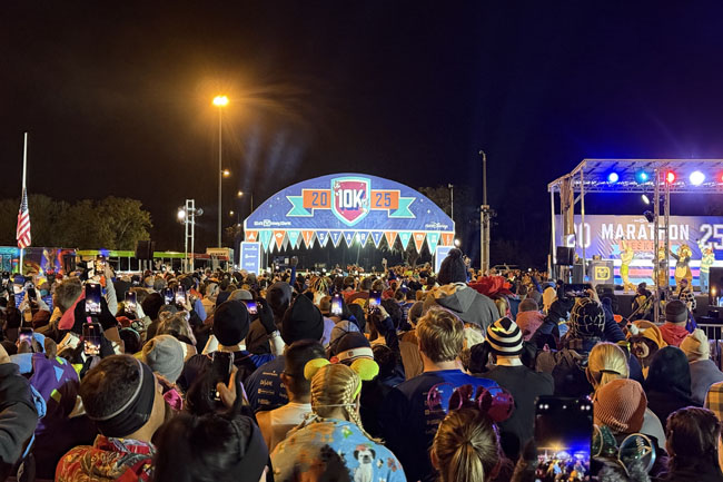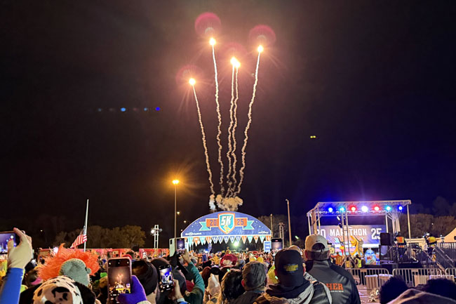Then there’s a .7-mile walk to the starting corrals with one last bathroom stop along the way. I usually try to wait as long as I can in hopes that it will keep me from having to go during the race! I got to my corral 10 minutes before the start and stripped my track pants and fleece jacket from Salvation Army on my way in.