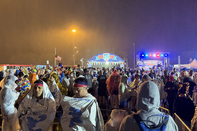 I dropped my post-race clothes at gear check on my way toward the expo center where I caught my bus outside a hotel. Like I’ve done four out of the five years, I took a bus that was chartered by Bauman’s, a running store in Flint. The bus is usually loaded with runners from Michigan and we have the added perk of comfort and not getting kicked off the bus when it arrives at Athletes’ Village. The downside is having to catch the bus by 7:00, at least an hour earlier than I would have caught one of the general buses. It’s worth it though, especially for the reassurance that I won’t have to sit outside for a couple hours in potentially iffy weather conditions. The chartered buses park by their own block of porta potties too.