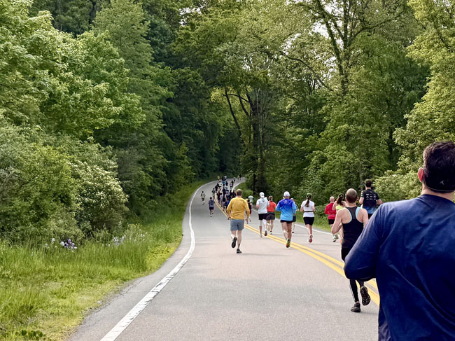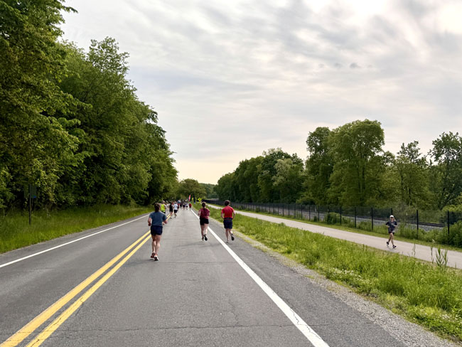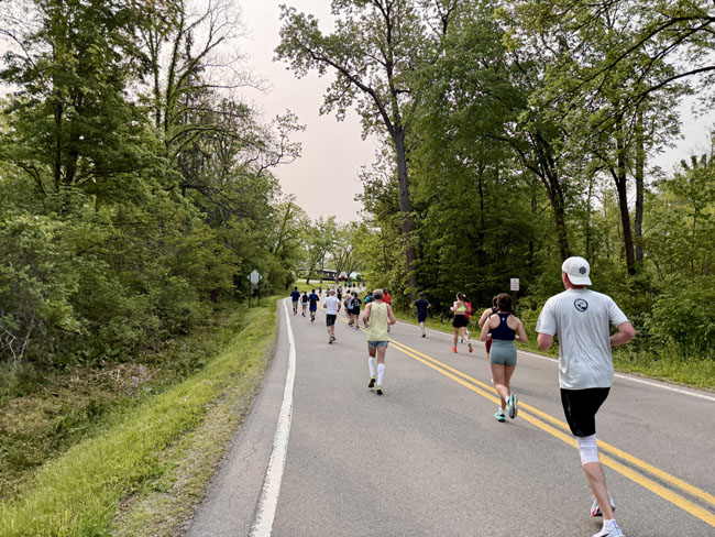 A slightly uphill segment heading out of the park is always a bit rough. Like last year, Olympic athletes added some extra distance to the first loop by doing an out-and-back segment on a rolling dirt road. When I headed out of the park, one of the volunteers said he thought I was the first Olympic runner! If that was the case, it definitely meant that some of the speedy women on the bike had done the aquabike, duathlon, or something else! When I hit the turnaround point on the dirt road, I saw several women running toward me. A couple of them looked pretty fast so I figured it was only a matter of time before they caught me.