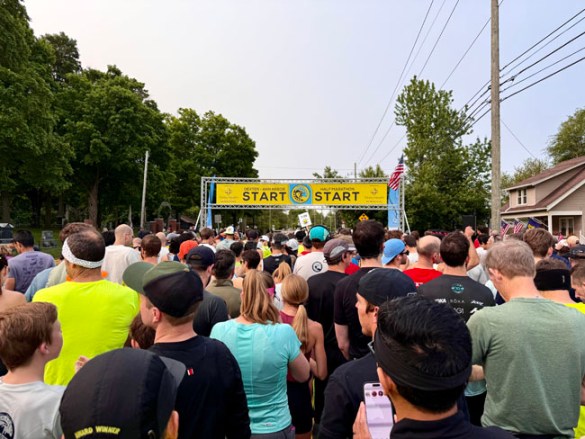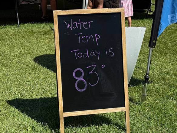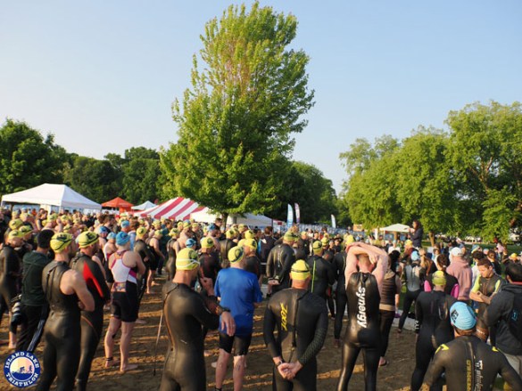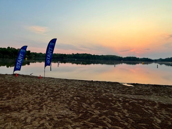 The pre-race meeting on the beach was due to start at 7:15 and I got into the lake to warm up a few minutes before that. Thanks to our recent heat wave the water was 83° – no wetsuits for this one! That’s actually the same as it was last year, although the heat wave continued on race day. We were extremely fortunate for a little break in the heat and humidity on race morning this year. The air was 67° at the start so I actually wanted to stay warm in the water as long as I could.
