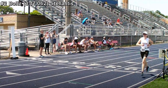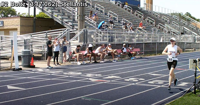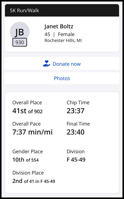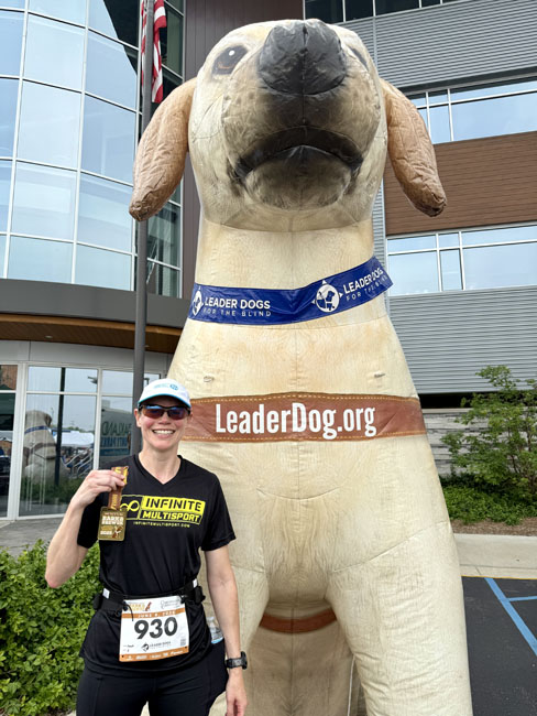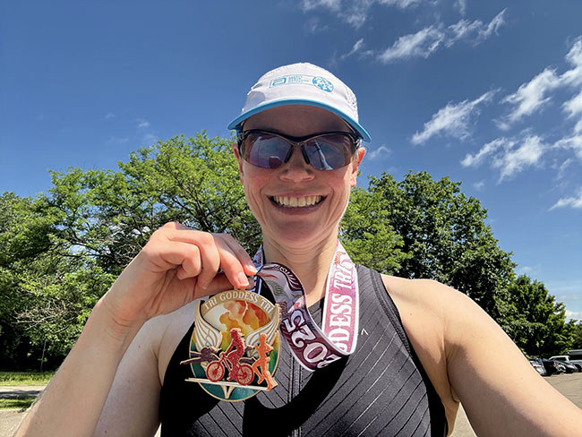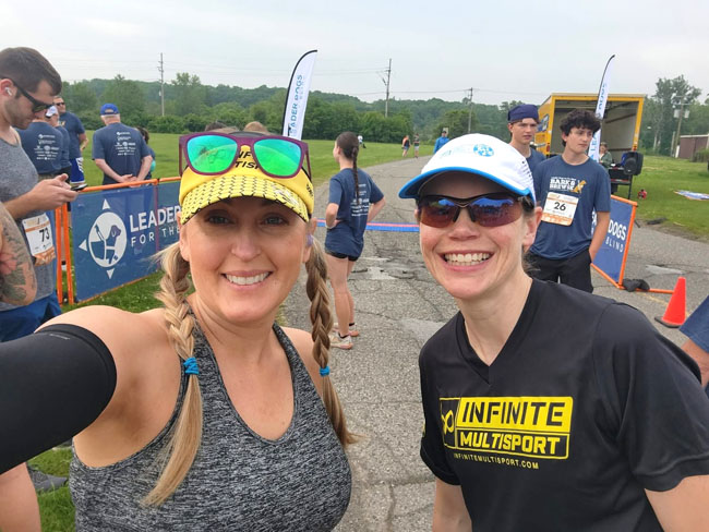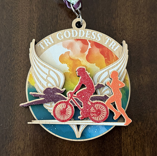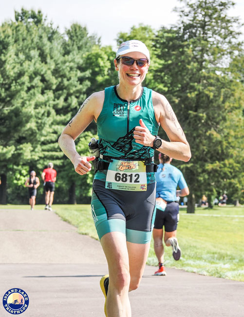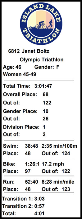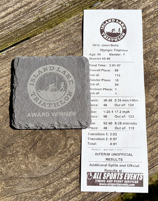 I passed a number of people out on the run course and had no idea if they were doing the sprint or Olympic. I was just surprised that no one had passed me yet. I went out for my second loop through the woods and looked back a couple times as I ran “scared” figuring that someone had to be on the verge of catching me. Still no one! That changed when I came out of the woods and was a couple minutes from the finish. Then I realized someone was just behind me and I tried to pick up my pace to finish strong. She did too. She clearly had a kick that I couldn’t match and I told her she was doing a great job as she passed. As we got to the finish, she was just seconds ahead of me and we had an exciting one-two finish. It was so exciting that I only heard a little bit of what the announcer said, which included how the last name of Boltz was fitting. I’ve gotten that a lot from race announcers and think it’s kind of fun.