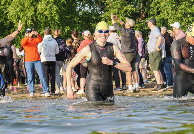 One really nice thing about this swim course is that we were able to swim without looking into the sun! So often we swim toward the sun at some point and it can be really difficult to spot buoys. This was one race where I could finally see all of the buoys without any issues. The Olympic distance had two loops to swim and after the last Olympic athlete started the second loop, the sprint athletes started their race. Sometimes the speedy sprinters will catch up to me before I can finish but it didn’t happen this time.