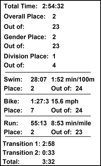 It wasn’t until I got home and got to analyze the results in more detail that I realized Kelly had actually won by 29 seconds. I hadn’t even thought about the factor of the chip time and that she may have started the swim behind me. I was even more relieved that she had that great finishing kick because she deserved to get that proper win. It would have been a bummer had I finished ahead of her and it seemed like I was first when I really wasn’t.