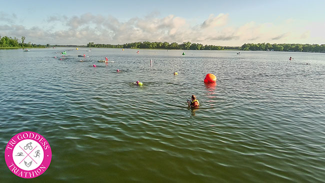 Just like last year, when it was time to line up for the swim, no one wanted to take the lead. I KNOW there were some speedy women who belonged up there! When it happened last year, I ended up near the front only to have people pass me immediately. Because of that I tried to hang back a little and ended up starting around the fifth wave with two of us starting together every few seconds. I was near a woman or two for the first few minutes, but eventually I found myself on my own so I think I started in the appropriate spot.