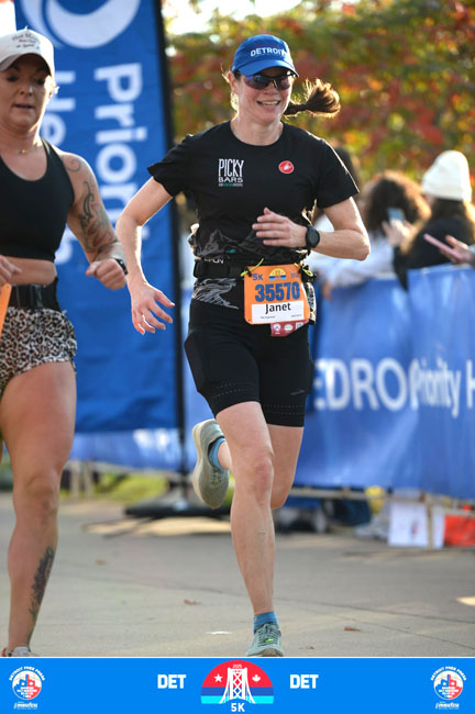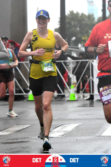 There was an announcer where we exited the bridge who made me laugh because he was wearing a swim cap. Once we hit the streets of Windsor, the course was nice and flat.