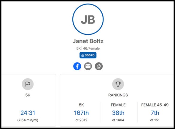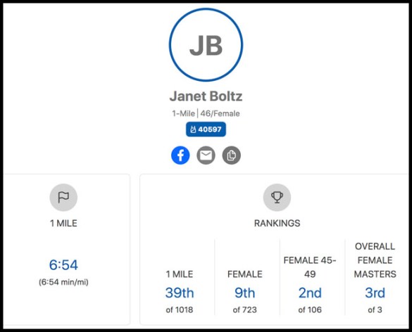 I didn’t expect any kind of award for my mile time! I checked the website to see if they gave age group awards or anything. I got the impression that it gets sorted out after the fact so maybe I’ll receive a surprise in the mail one day!