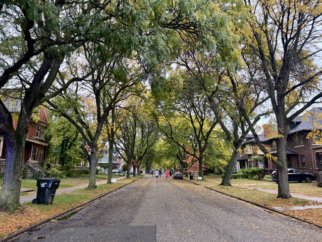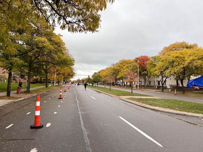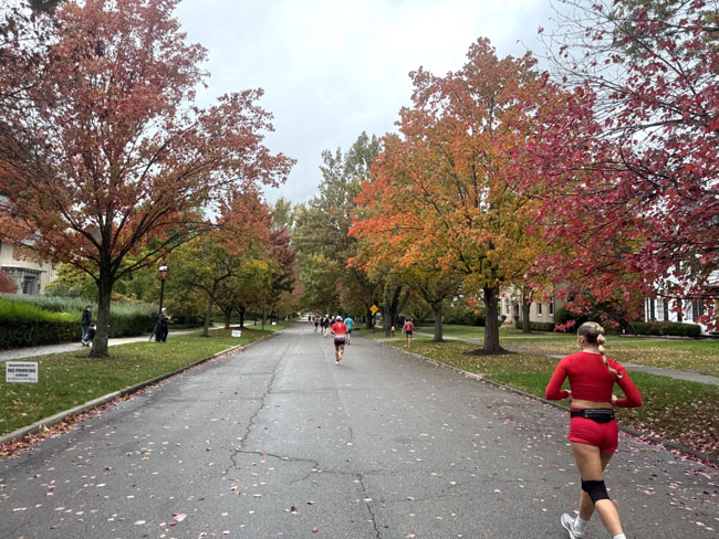 It took a while to run the straightway that took us to the Indian Village neighborhood so at least the fastest runners on the other side of the road provided some distraction, not to mention we had some nice fall colors.