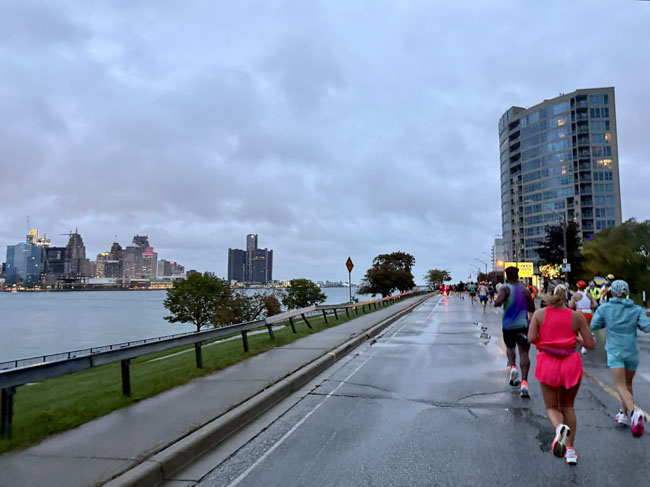 It was pretty cool getting to see the Detroit skyline from the other side of the river. Of course it would have been more scenic minus the rain. The rain seemed to die down by the time I was 3-4 miles into the race which was a relief.