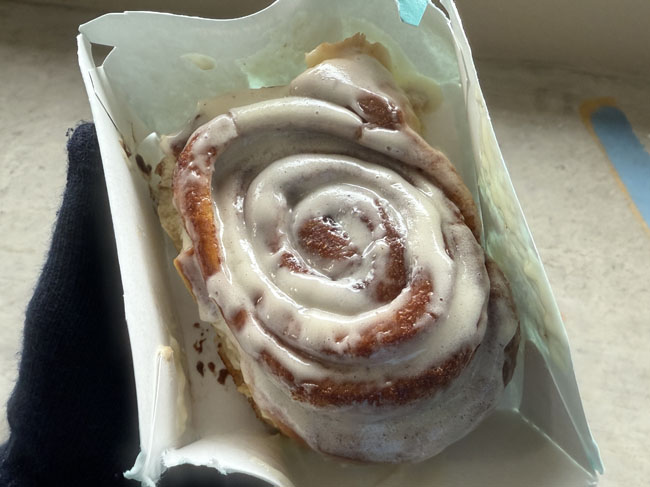 So many local 5Ks even load up on bagels, muffins, cookies, bags of chips, granola bars, etc. I know they had a lot of racers to move through and a bag of snacks makes it flow, but still. I ate another one of my protein Picky Bars – I’m always prepared. I decided I needed some kind of substantial treat so I stopped at the Cinnabon food truck.