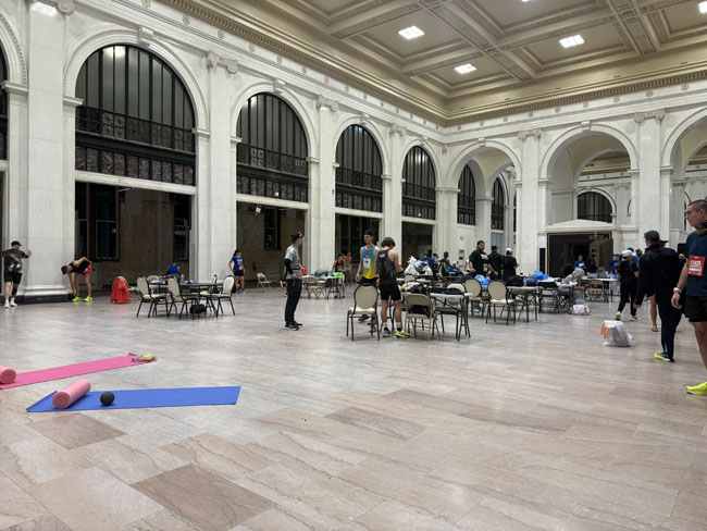 I bought shoes at RunDetroit this spring which gave me entry to their Freep VIP gathering. They had a nice big area inside with their own gear check, tables, snacks, and real bathrooms. I was only there briefly and used a foam roller and hit the bathroom before venturing back out into the rain.