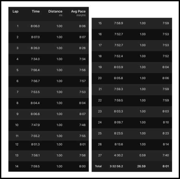 By the time I was 12-13 miles into the race my legs got a little tired and I hoped I hadn’t been too ambitious with some miles under an 8:00 pace. Despite hints of fatigue, I still kept rolling along consistently though!