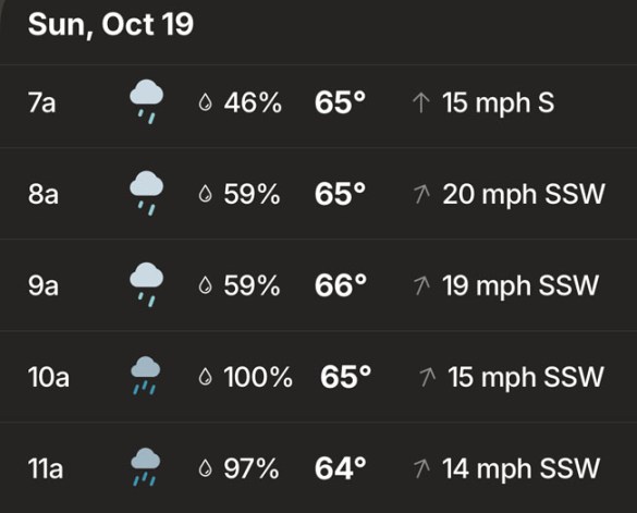 There had been plenty of talk about the rain and wind in the Facebook group leading up to the race. I read through recaps of other rainy races I’ve run to assure myself it would be fine. The one good thing was that it would be on the warmer side so at least I wouldn’t have to worry about being cold. No need for arm sleeves or gloves if it would be at least 60°. Minimal, tight clothing, a hat, and plenty of Aquaphor/Body Glide was all I really needed.