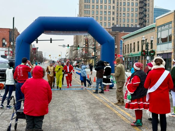 The race started at 8:00 on Saturday morning and I parked several blocks away just before 7:00 which gave me plenty of spare time. I went to pick up my bib and was grateful that I was also able to get a shirt in my size despite my last-minute registration. I went back to the car and got everything ready for racing. I had so much extra time that I went back to the packet pickup building and hung out inside to stretch and stay warm. Since Santa was there, I decided to get a photo.