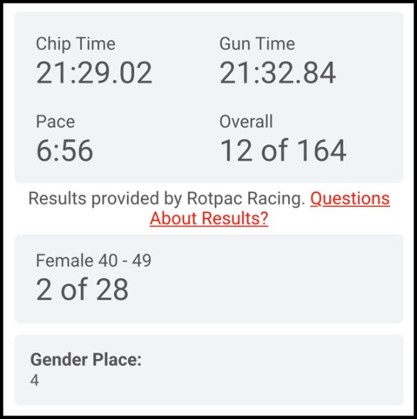 I had suspected the course was going to be a little short and I came up with 3.03 miles instead of 3.1, the same as a guy I talked to in the finishing area. I’ve run plenty of extra distance at many of my recent races so I guess it’s only fair for one to pop up where I was a little under instead of way over! That meant my speedy time of 21:29 was a little deceiving. My Garmin had me averaging 7:07 per mile vs. the 6:56 that showed in the results.