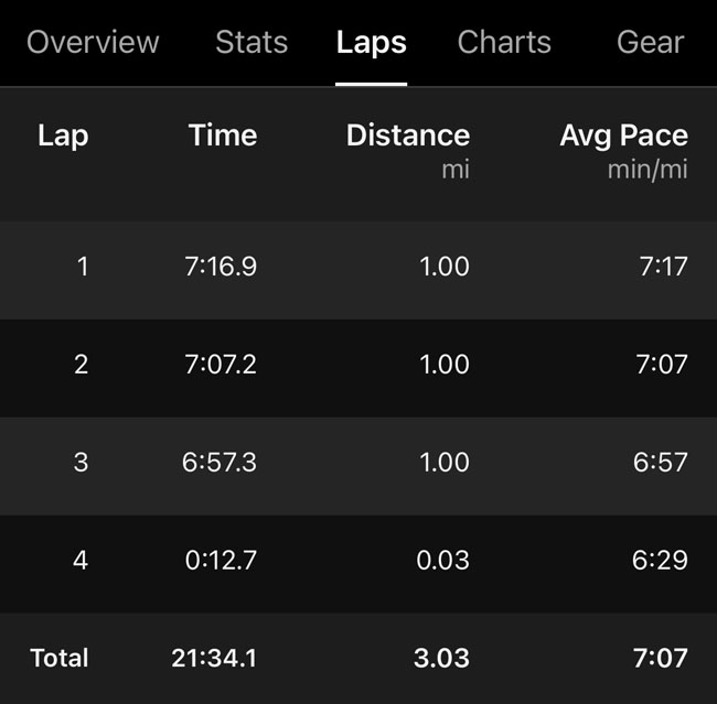 It was interesting to check out my splits afterward and realize that I got 10 seconds faster with each mile. Other than running a few quick bursts of speed, like 30 seconds to a minute at a time in recent weeks, I haven’t done anything this fast and was pleasantly surprised to see what I had in me.