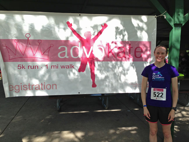 It was an open course, meaning we still had to watch out for cars. Police and volunteers were out though, and they were great. At the turnaround point, I couldn’t believe what I witnessed. A woman waiting in her car rolled her window down, cigarette dangling out of her hand. She said to the volunteer, who was a kid from an area cross-country team, “Hey dude, I’ve gotta get to work!” Poor kid. He was good about it, but it was so obnoxious.
