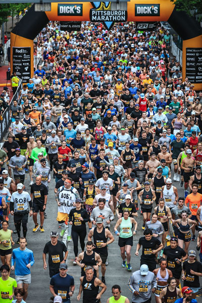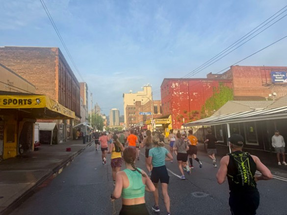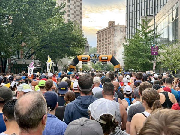 One bonus for having the race on a Sunday is that street parking is free. I got to town an hour before the race started and was able to find a spot a couple blocks away. I made a bathroom stop, did a half mile jog to warm up, then dropped warm clothes at gear check about 20 minutes before the 8:00 start. It was in the high 40s and I was concerned I might be cold standing around in a t-shirt while I waited, but between my jog and the anticipation of the race, I was fine. I lined up in the corral early enough to situate myself right by the pace group I hoped to follow. Last year I hit gear check later and faced a line, then it was hard to get where I wanted to be in the corral and I started farther back than I should have. I learned my lesson for this year.