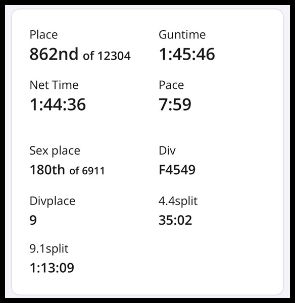 I know well enough that it’s rare for me to actually run the shortest possible distance on a race course even when I aim to run the tangents. My watch is not always reliable either and it showed me running through buildings rather than on the street when we were downtown. It’s typical for me to end up with 13.2 miles in a race rather than 13.1, but going over 13.4 was a bit more extreme. I’m sure construction along the course and a different route through the Arb could have contributed to some of that. It’s just nice to know that I would have been even closer to 1:40:00 minus some of the extra distance.