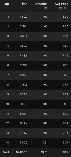 I managed to run a 7:01 pace for the thirteenth mile, then instead of having .1 left, I still had .43 more according to my watch. That was nearly half a mile at a 6:40 pace. So much for being disciplined and taking it “easy.”