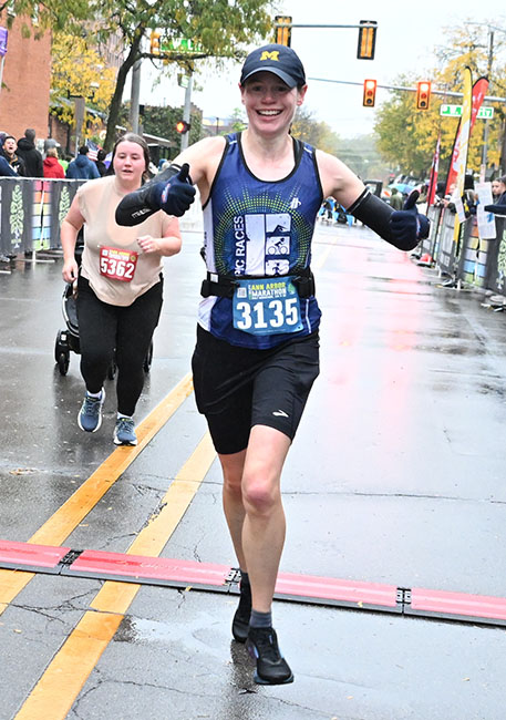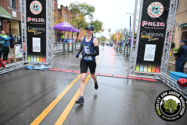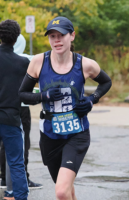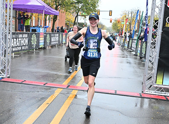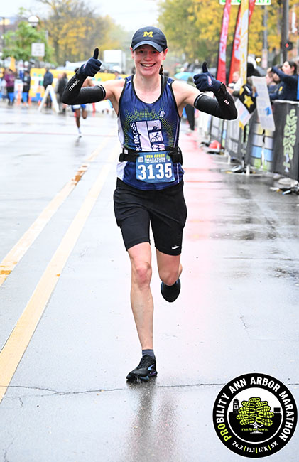 We rejoined the familiar part of the course just in time to head up the hill by UofM’s hospital. The climb is a little tricky, but the REAL hill comes soon after in Nichols Arboretum. That’s where we started to overlap with 10K runners on the trail segment of the course. Although “the Arb hill” is a real grind, somehow it wasn’t even my slowest mile of the race. It definitely felt like the hardest part! I was working so hard when I exited the Arb that I didn’t even see one of the photographers. I’m not so smiley when I’m caught off-guard after climbing a hill!