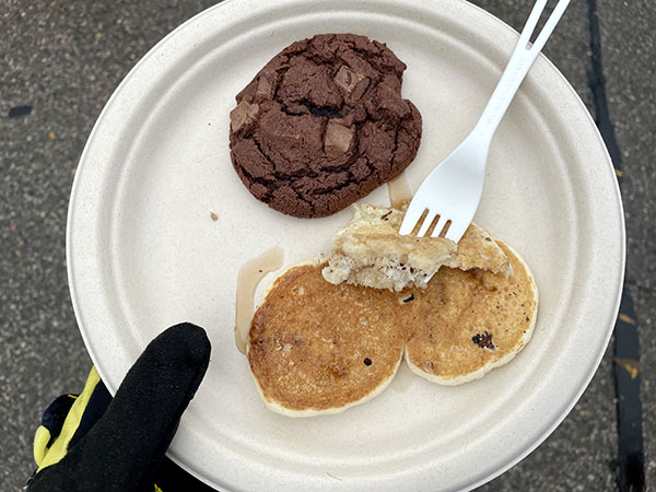 I typically stay warm enough while running but knew that a rainy day in the 50s could be trouble for me once I came to a sudden stop. I had that cozy new Epic Races hoodie in my gear check bag along with pants and a fresh pair of gloves. I got some pancakes, mac and cheese, and another cookie after that.