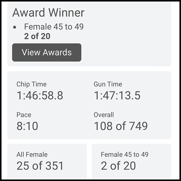 I finished just a second under 1:47. Although I would have liked to have averaged an 8:00 pace and been a few minutes faster, I still had a decent run on a challenging course and my hip didn’t really hurt. Plus, somehow I’d been fast enough to place second in my age group!